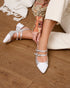 Zapato de tres hebillas combinado en piel salinas con piel laminada plata, zapato abierto por el talón. Planta y tacón forrados en piel salinas. Interior y planta forrados en mestizo color nude, altura de 4,5 cm.