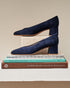 Zapato salón en ante color AZUL, escote en forma uve. Forro de cordero, muy blando y favorece la adaptación al pie con muy pocos usos.